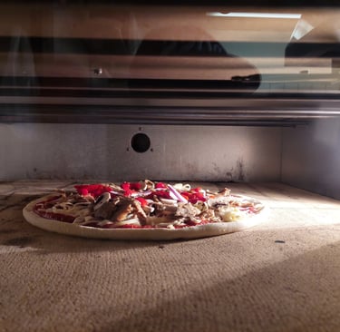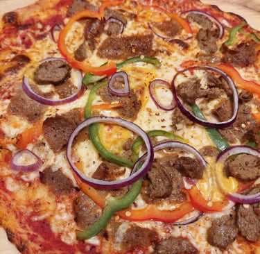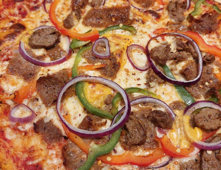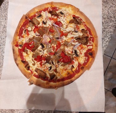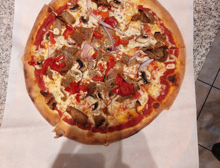 tomatsås, ost, kebab, champinjoner, lök, paprika